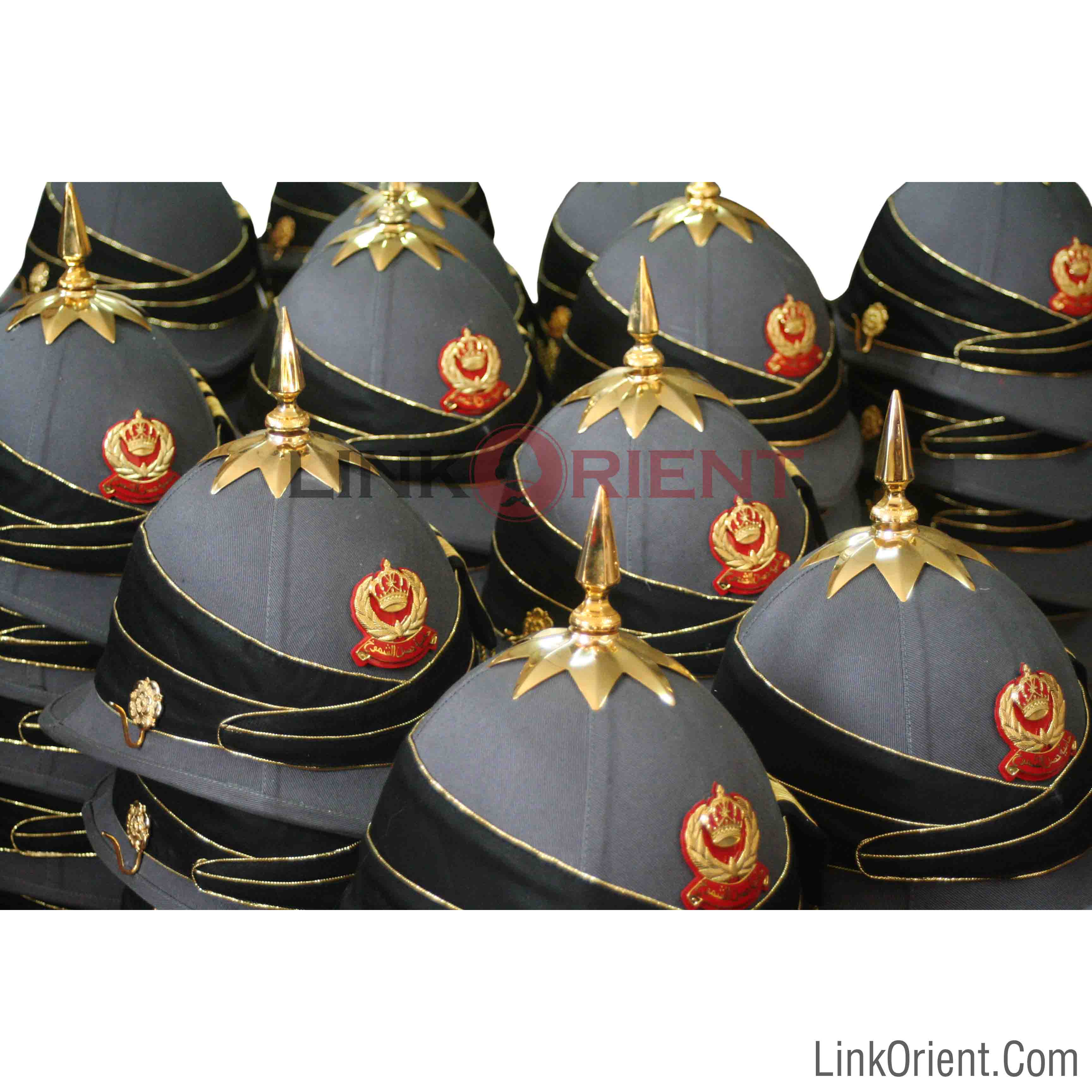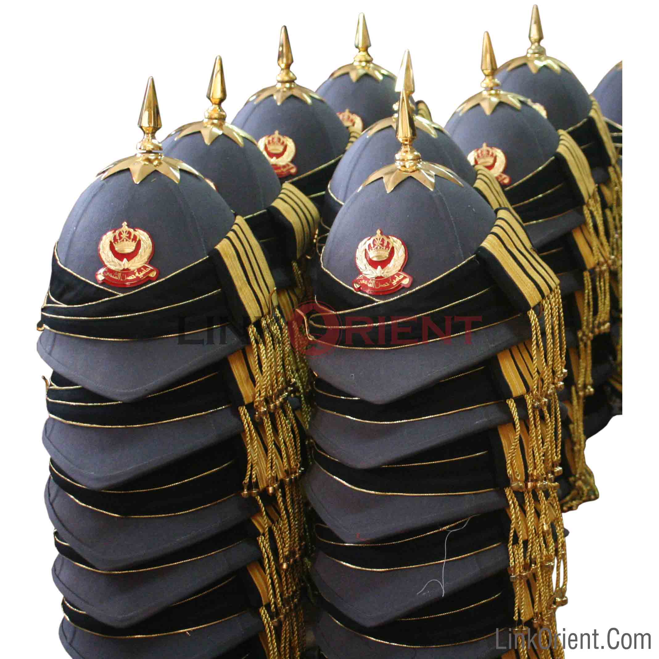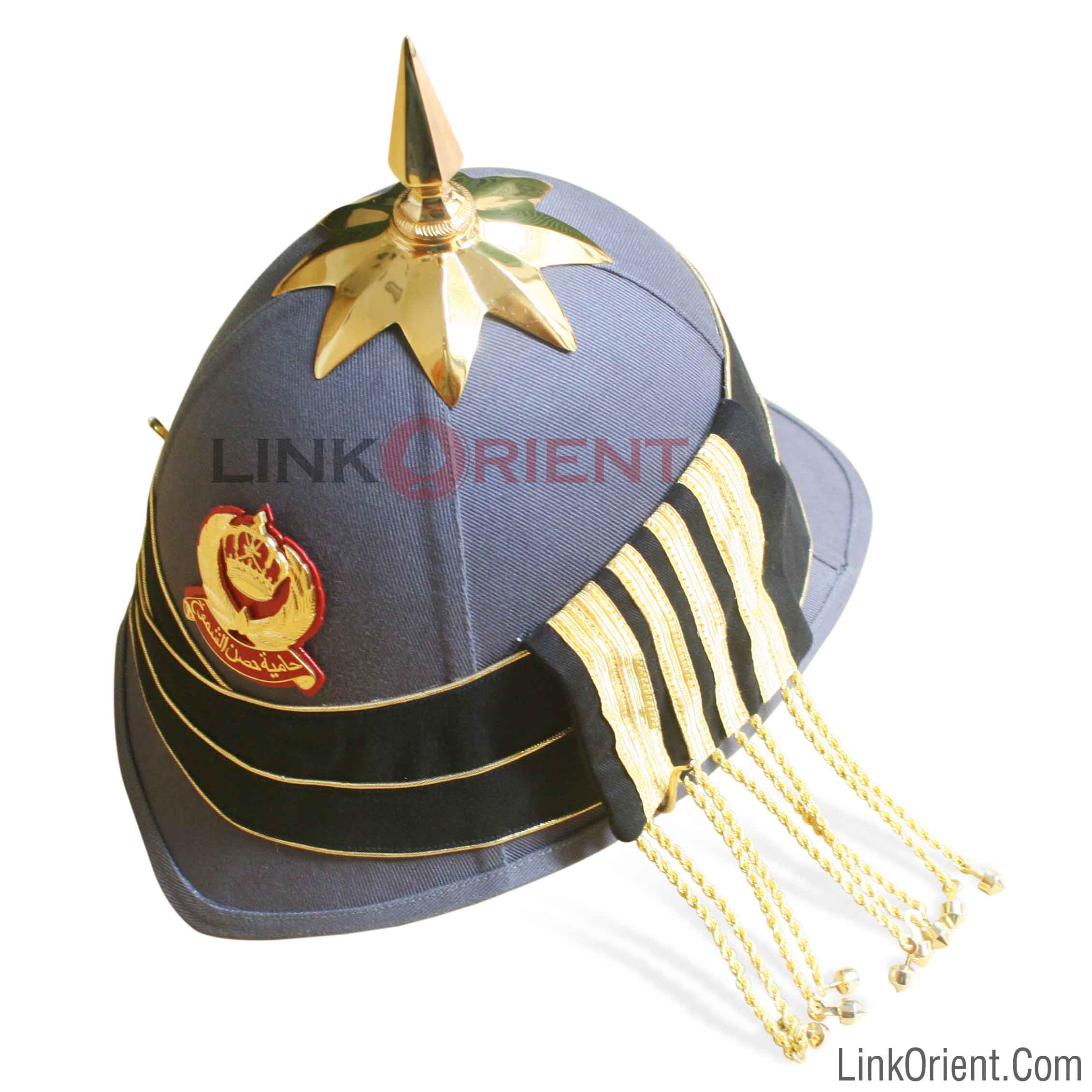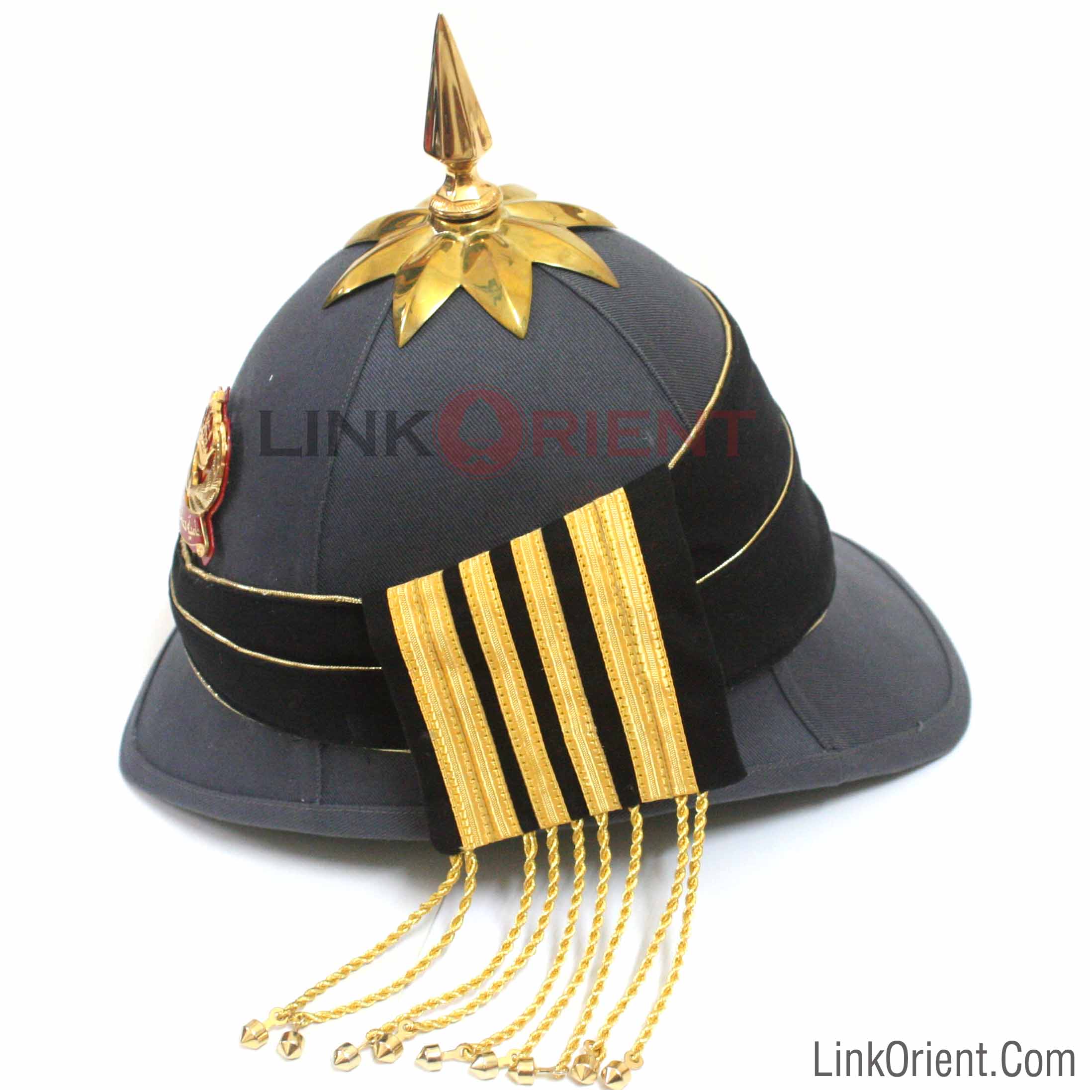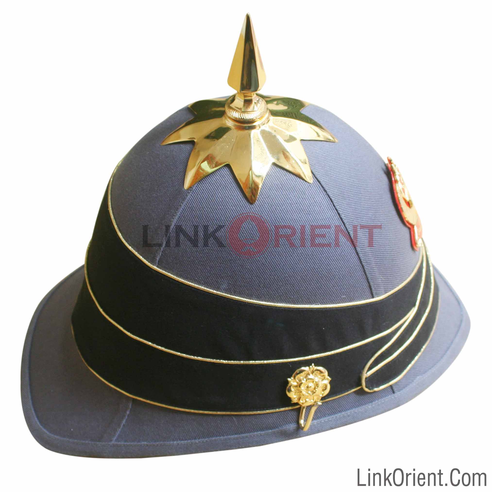 The British home service helmet is a variation of British Foreign Service pith helmet. It was adopted a broadly similar helmet, of dark blue cloth over cork and incorporating a bronze spike, for wear in non-tropical areas. The helmets come with various types of decoration fittings to indentify different officer ranks as well as units and departments.
