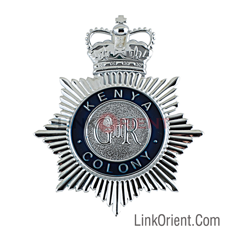 This is the Kenya colony cap badge used on the Wolseley pith helmet pattern. The product is stamped by machine and then finished by hand.