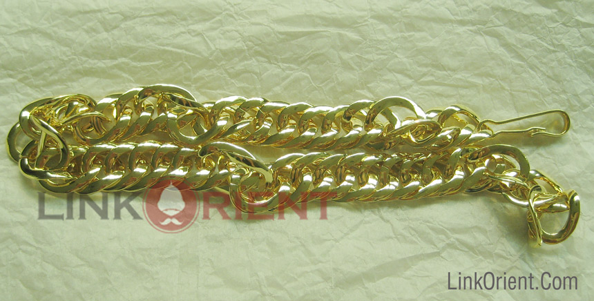 Material: Brass Backing leather: High quality leather Color: 24 k Gold plated. Also available inNickel and chrome plating. Length: Up to 48cm. Other sizes on request. Product details The pith helmet chin chain is used for various type of ceremonial helmets.