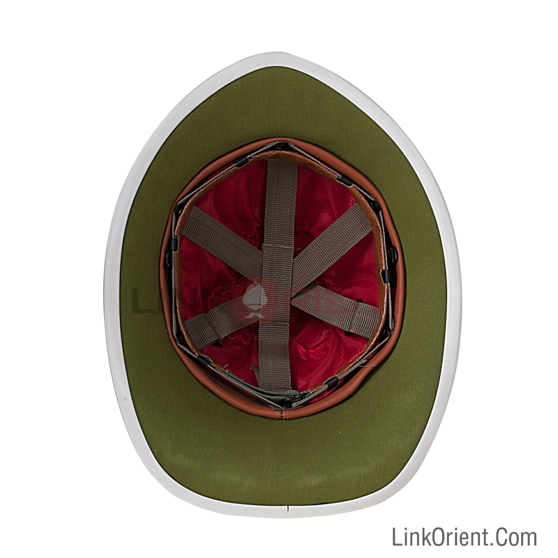 This helmet is new replica made of pith, cork or composite material, covered with white fabric or khaki twill at the outside. These helmets normally come with front military badge - metal plate, a 'ball top' or a 'spike top', which is used as an ornament to cover the ventilation hole. Outside cover: High quality khaki twill. Inside liner: Shade green or cream cotton fabric. Chinstrap and sweatband: High quality leather. Helmet fittings: Helmet badge, helmet chin chain, ventilator, side hooks, helmet top ball, helmet top spike, helmet top crosspiece. Fittings are 24k gold or chrome plated. Color: As pictured. Other colors on request. Size: One size fits all. Other sizes on request. Product detailsRoyal Marines Pith Helmet: