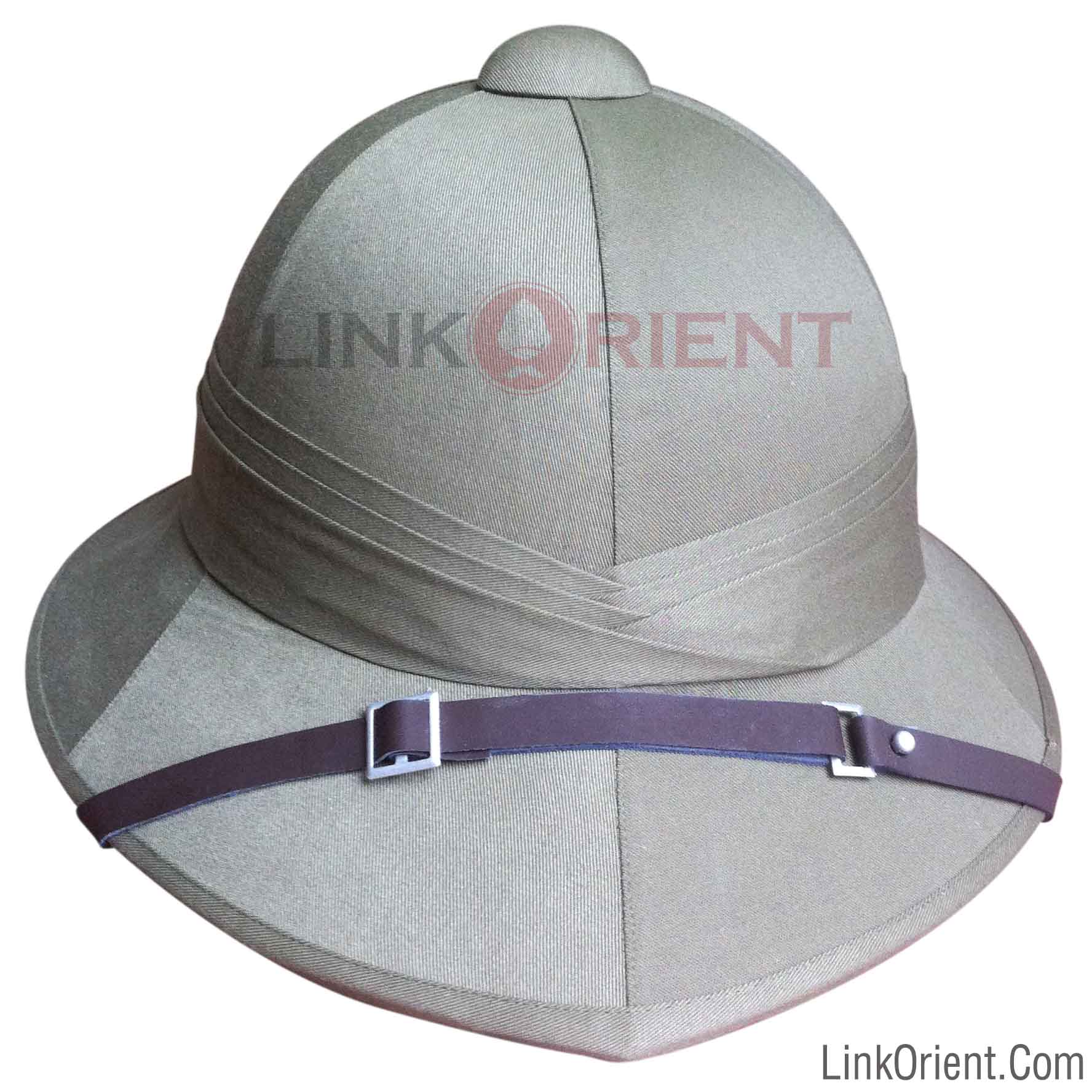This Wolseley pith helmet is 100% handmade in Vietnam using pith (of an indigenous tree - Sesbania Javanica living in swamp) and knowhow (learnt from the French) retained and unchanged since 1900s (French colonial period). With its swept-back brim, it provides greater protection from the sun than the other pith helmets. Outside cover: High quality khaki twill. Inside liner: Shade green or cream cotton fabric. Chinstrap and sweatband: High quality leather. Pith helmet fittings: Ventilator, eyelet and buckle made of aluminum/brass. We supply other fittings: helmet badge, helmet top spike, helmet top ball, helmet domed base, helmet rosettes, helmet chin chain. Color: As pictured. Other colors on request. Size: One size fits most. The velcro lock help adjusting Finishing: Handcrafted. Product detailsSuch was the popularity of this Wolseley pattern pith helmet that it became a common civilian headgear for Westerners in the tropics and sub-tropics from the mid-19th century. The civilian pith helmets usually had the same dimensions and outline as its contemporary military counterpart though it lacked decorative extras such as badges, top spikes or balls. It was worn by men and women, old and young, both on formal and casual occasions, until the 1940s. Both white and khaki versions were used. It was often worn together with civilian versions of khaki drill and/or bush jackets.